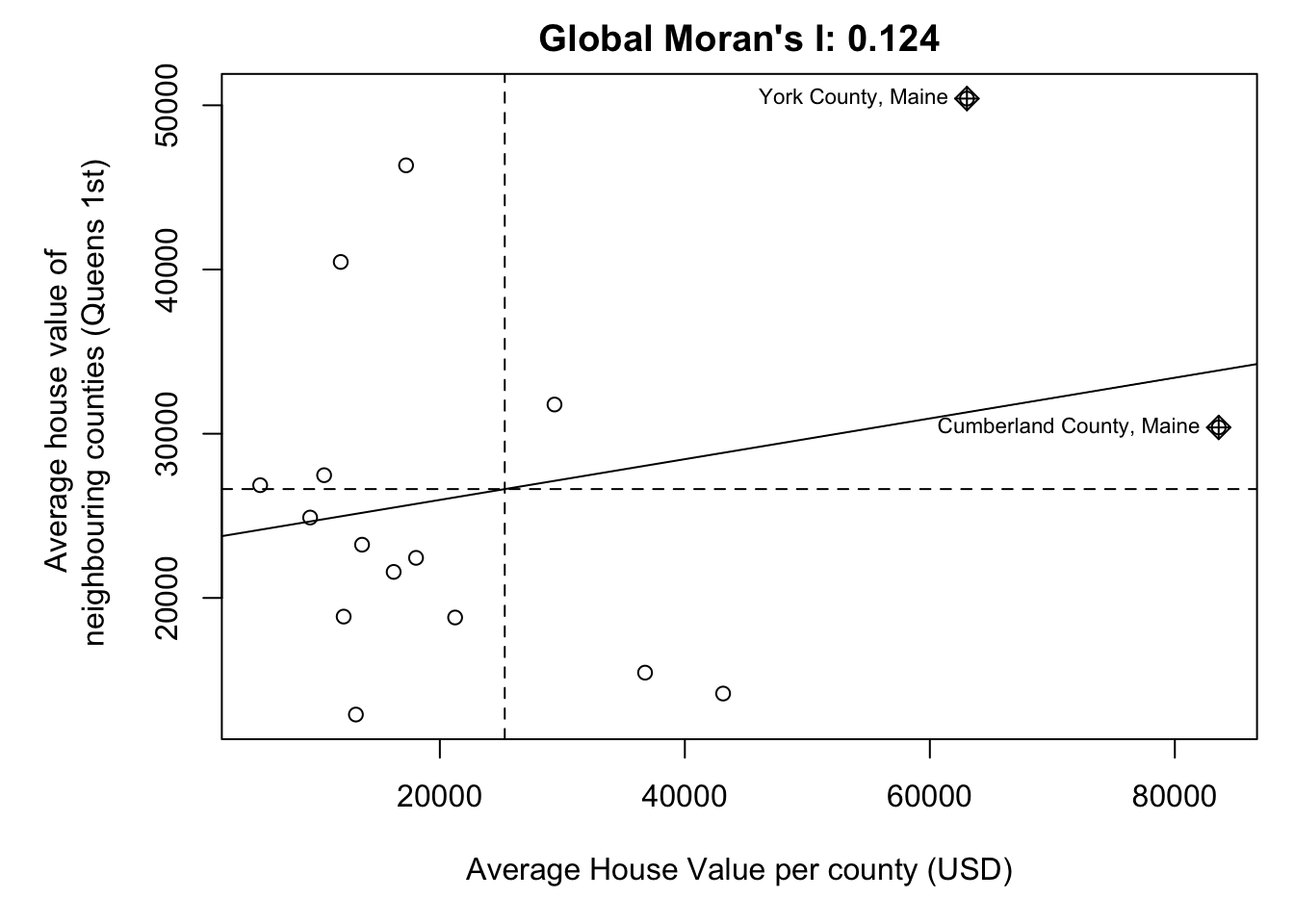 We then plot HouseValuelag against HouseValue for each county. A positive slope means positive autocorrelation (smooth clusters, high values surrounded by high values). A negative slope means negative autocorrelation (high surrounded by low, chessboard effect).