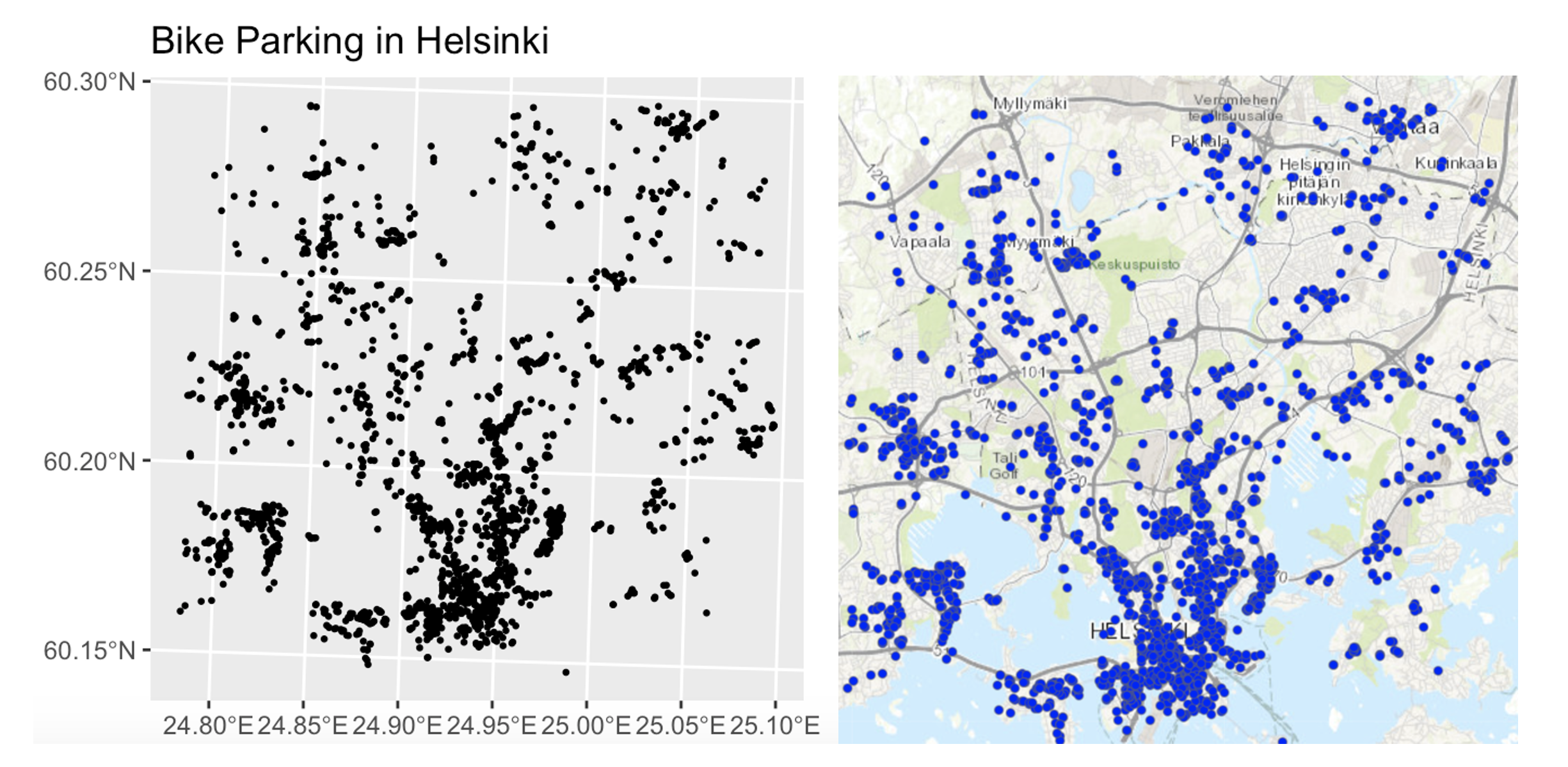 Equally, data might look clustered, but in fact there are just areas where it’s not possible to have points. For example, without the nuance of the background map you might get very different conclusions from an analysis of bike parking in Helsinki: