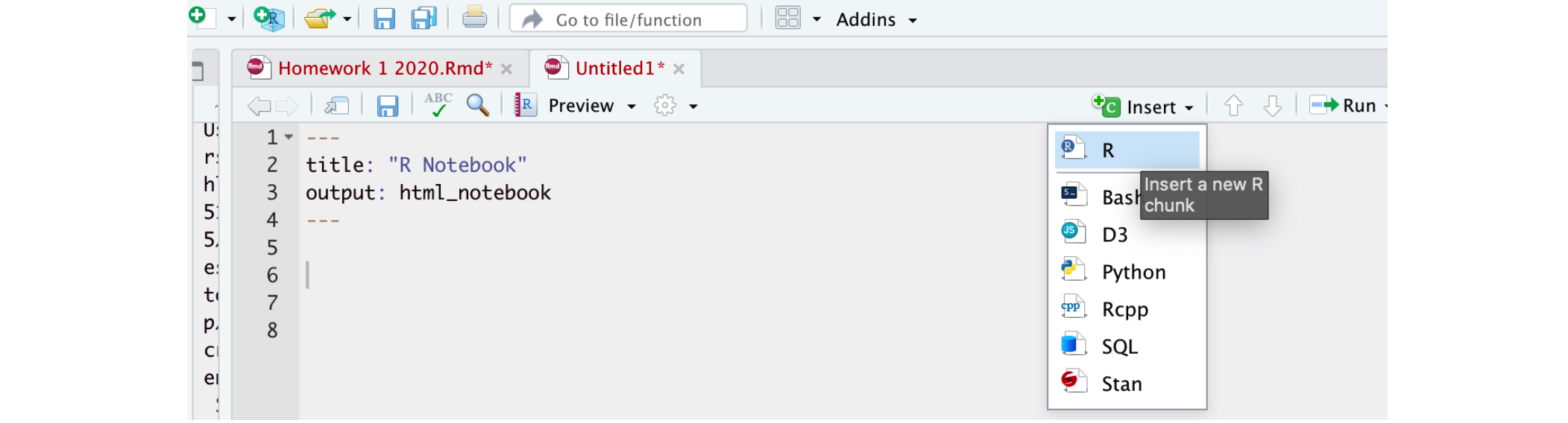 Now, create a code chunk by clicking on the Insert R-code button on the top right.