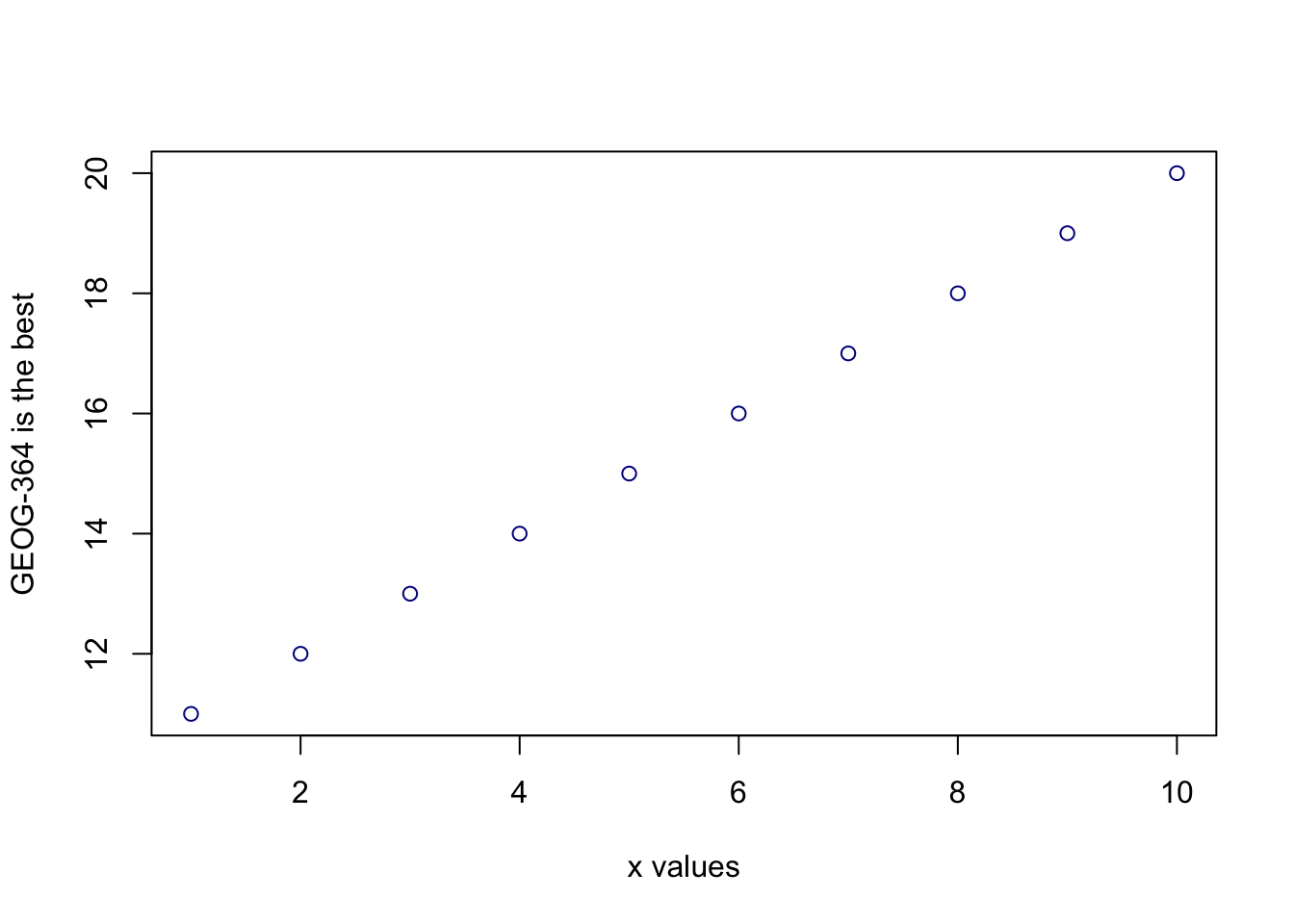plot(1:10,11:20,col="dark blue", xlab="x values",ylab="GEOG-364 is the best")