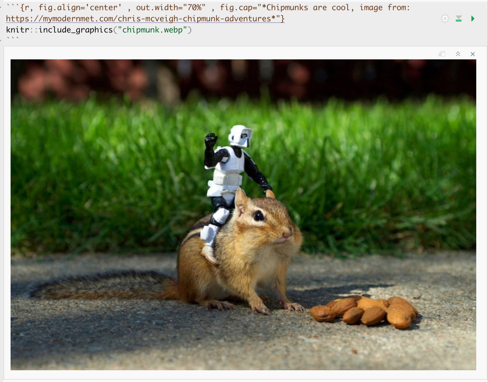 If you run the code chunk by pressing the green arrow, you will see the picture, but not things like the caption.