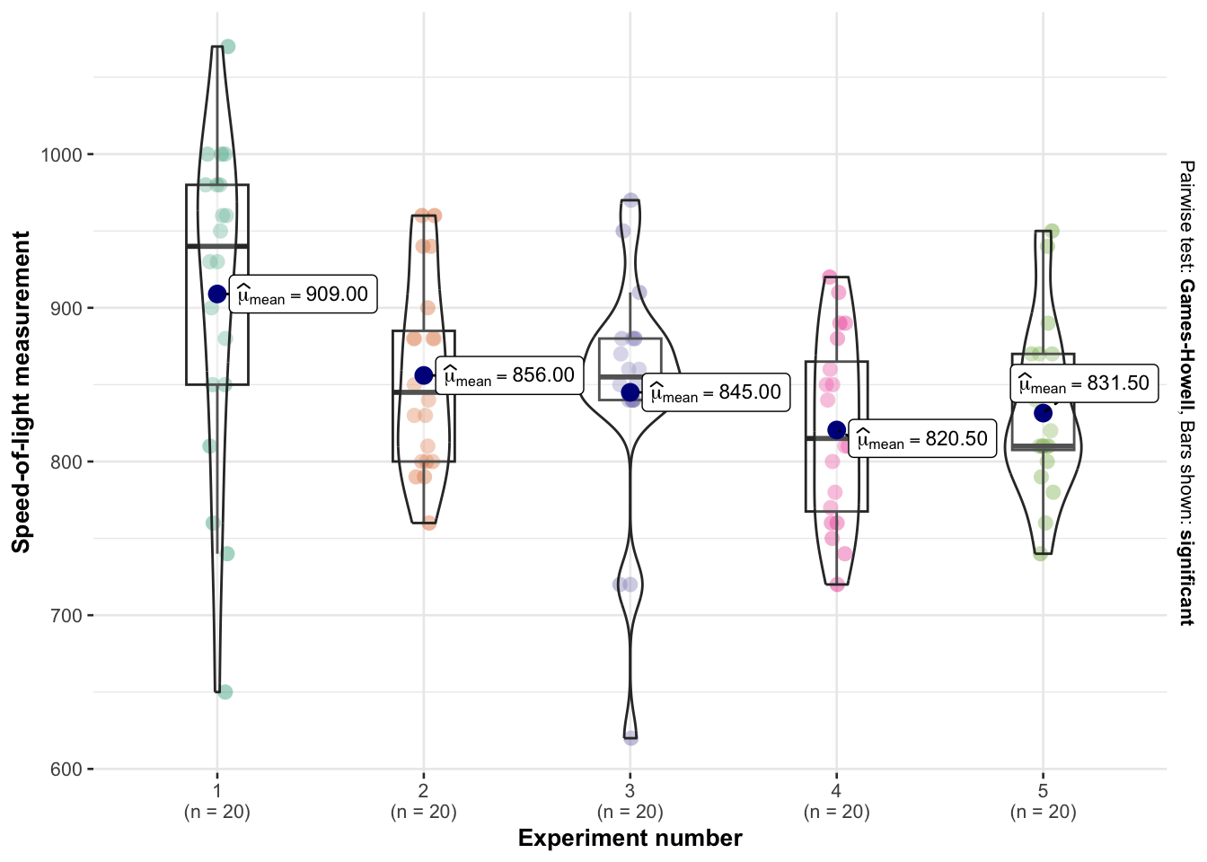 We can also use violin plots to compare categories. Our houses data isn’t really big enough to do this justice, so here’s an example from another dataset on an old science experiment. We can customise it even more using this tutorial (https://www.r-graph-gallery.com/web-violinplot-with-ggstatsplot.html)