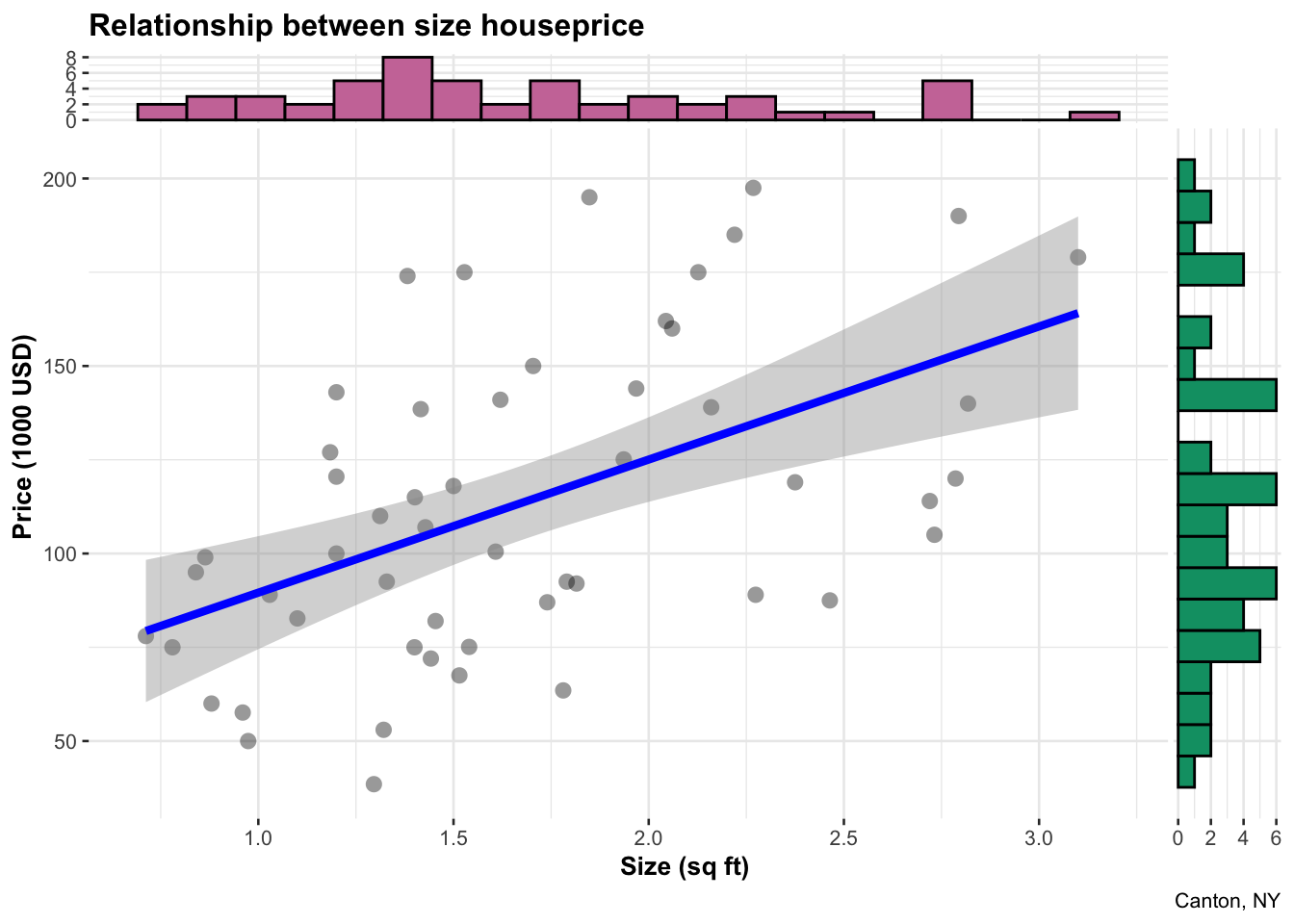 This is really useful, try zooming in or clicking on a few points. If you don’t want the line of best fit, simply remove the geom_smooth line. It’s also very easy to add in color to see another variable. For example, here I also add in the house size. If you don’t want that, just remove the color=Size.