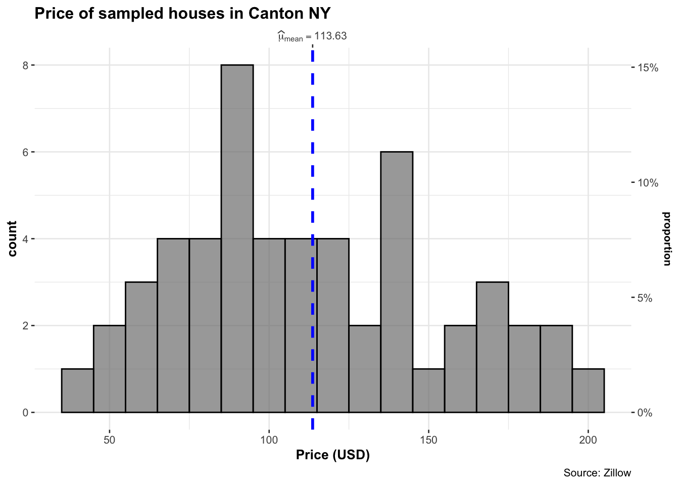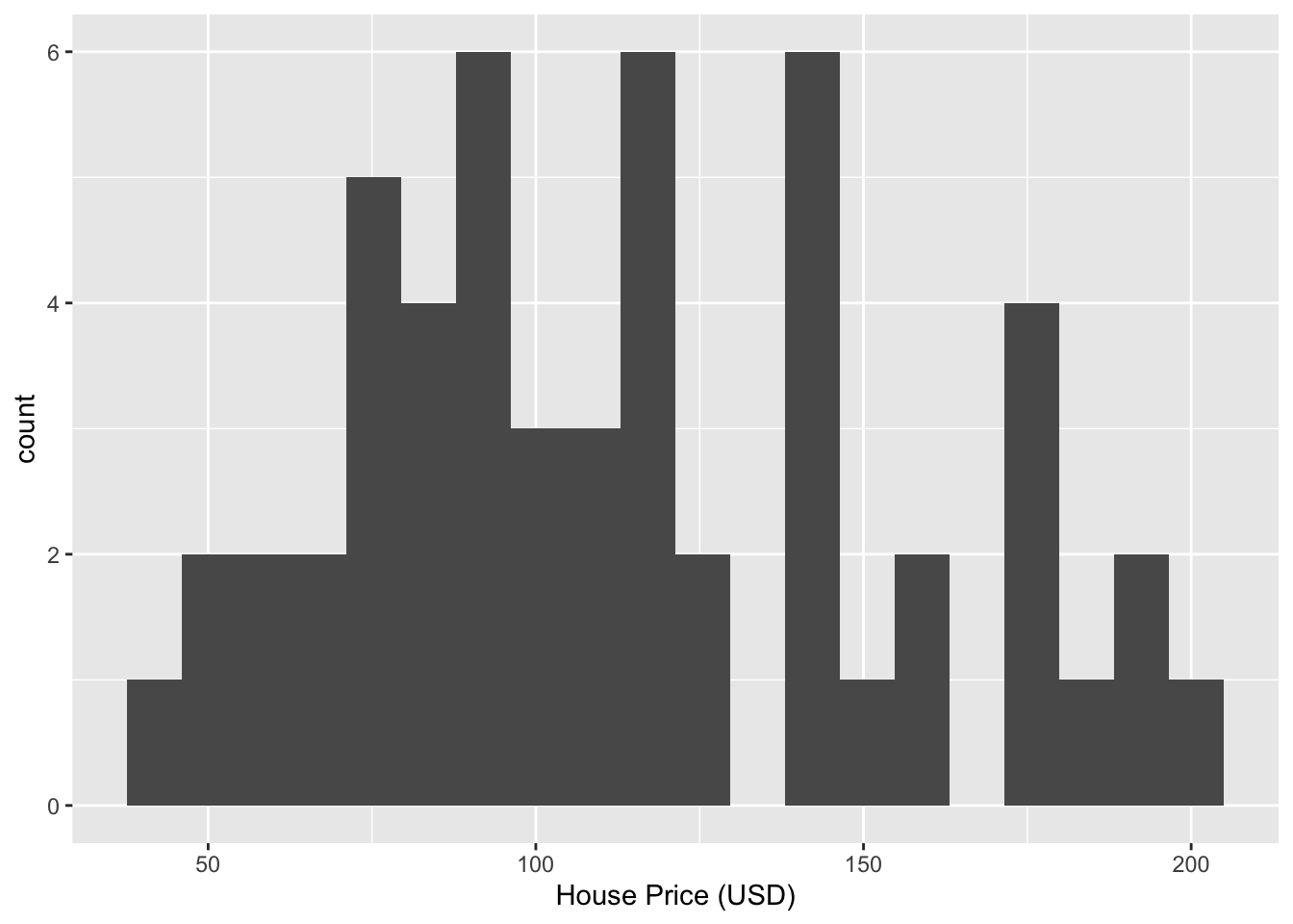 Throughout this tutorial, we will the HousesNY dataset from the Stat2Data package. This has the columns: