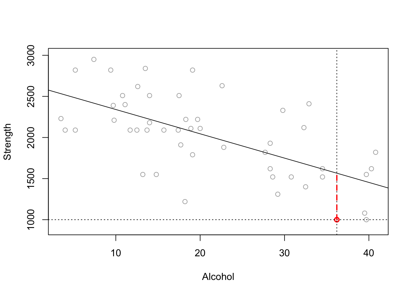 Imagine you are interested in determining whether or not alcohol consumption was linearly related to muscle strength. You measured the total lifetime consumption of alcohol (x) on a random sample of n = 50 alcoholic men. They also measured the strength (y) of the deltoid muscle in each person’s left arm, then created a linear model to forecast strength.