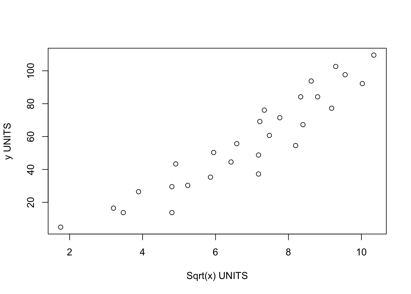 plot(data$y~data$transform_sqrtx,xlab="Sqrt(x) UNITS",ylab="y UNITS")