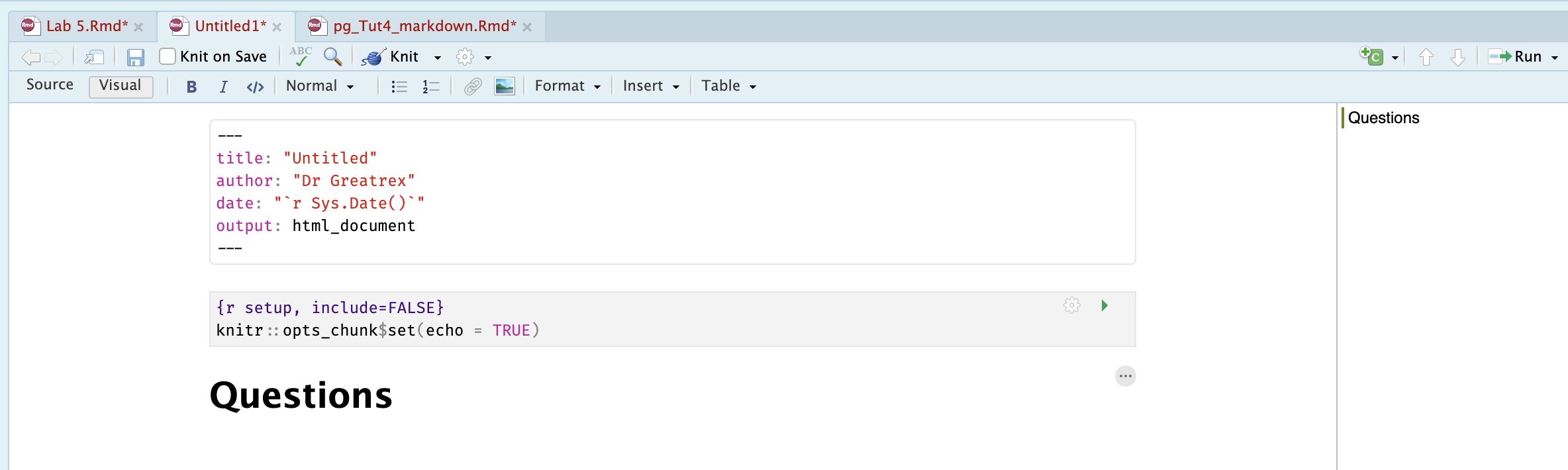 datasetsandtidyversepackages which will allow us to use their commands in our analysis.- The options mean that it won’t show any error messages or warnings when you press knit.