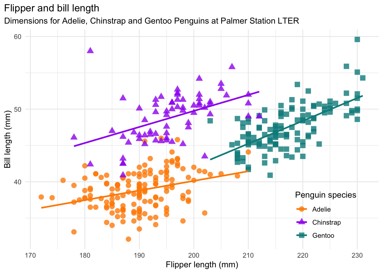 - [Q3.7] If you look here, https://allisonhorst.github.io/palmerpenguins/ you can see that the owner of palmer penguins has made a more advanced scatterplot. In your report, critique your basic analysis in terms of understanding the relationship between flipper length and bodymass. How might this change your population or interpretation?