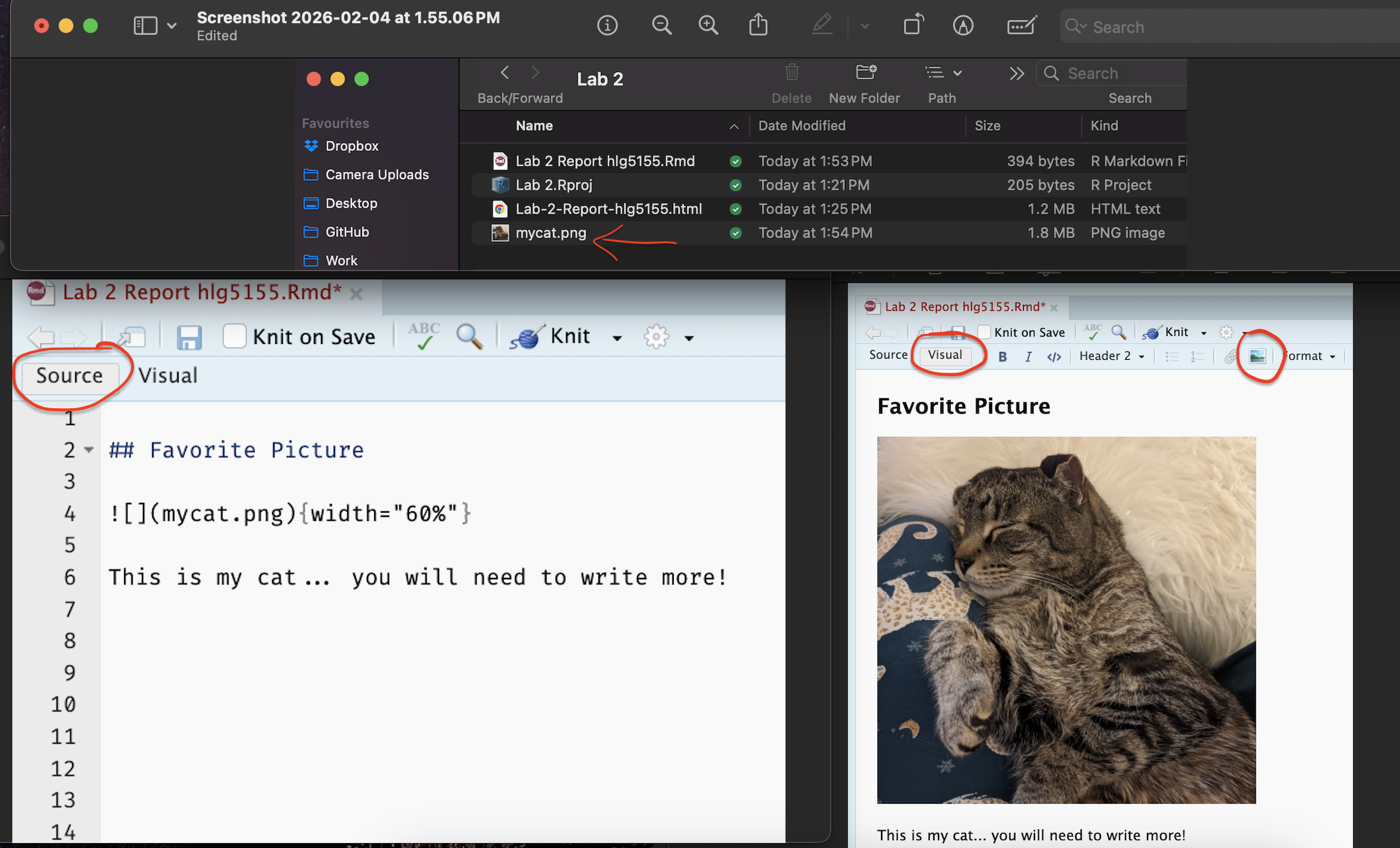 [B] Go back to R-studio and make sure you are in visual mode. Click on the little “add picture icon at the top” and insert your picture underneath the Favorite Picture heading.
