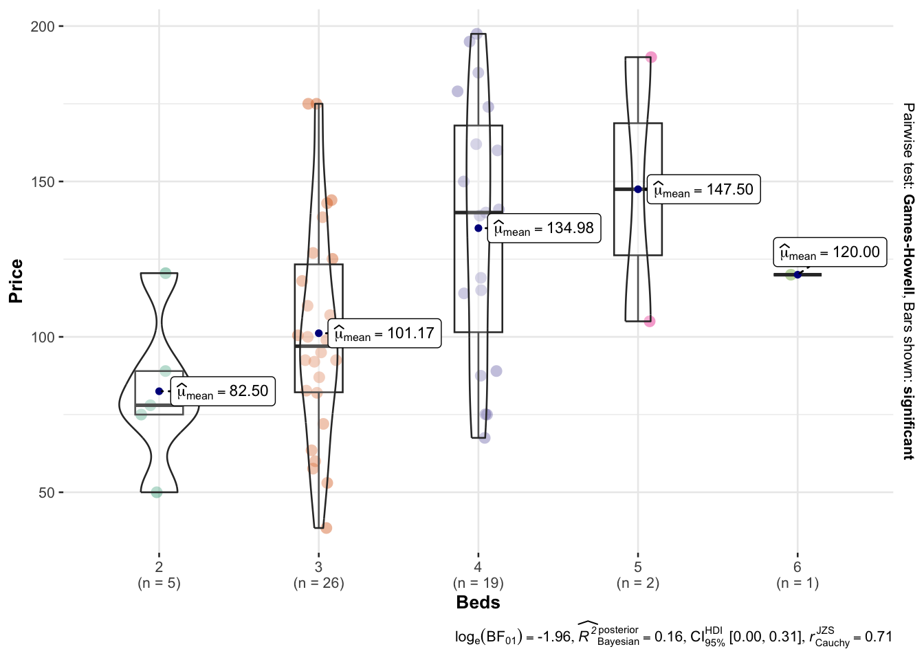 ggbetweenstats(data = HousesNY,x = Beds,y = Price,
