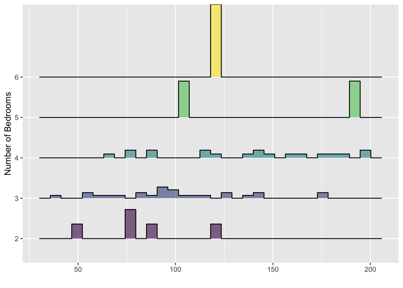 These are another way of looking at histograms for different groups. They work especially when your grouping data is ORDINAL (has some inherent order). So bedrooms would be a good example